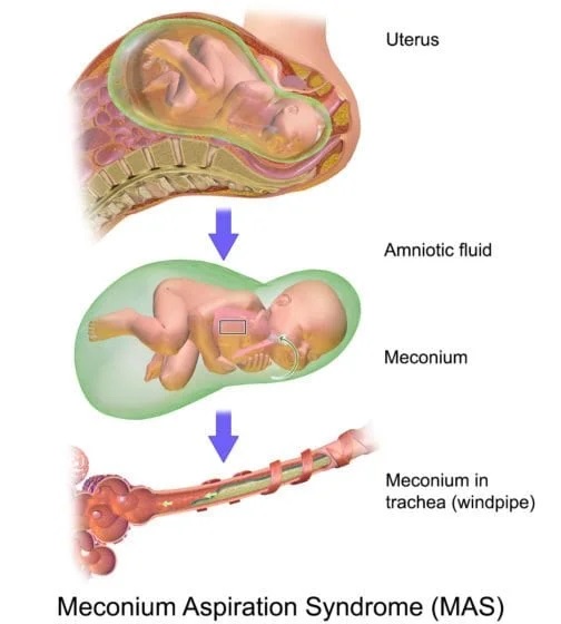 در هنگام زایمان و شروع اولین تنفس نوزاد، مایع آمنیون و مدفوع به ناحیه دهان استنشاق و بلع میکند و همزمان تلاش جنین برای گرفتن اکسیژن افزایش مییابد و مدفوع بیشتری وارد راه هوایی میشود.